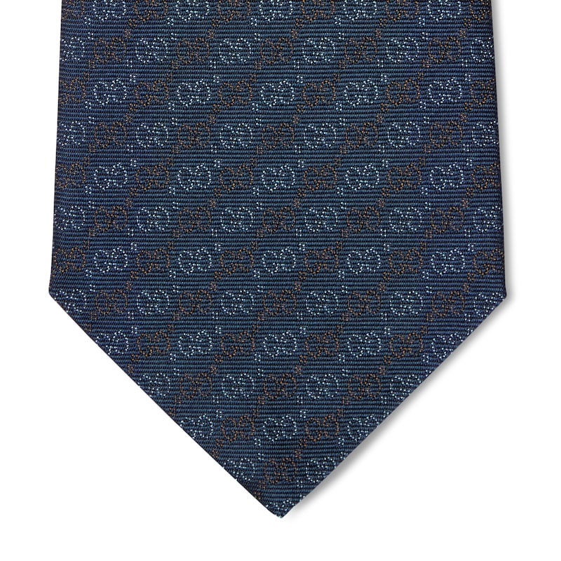2026早春系列男士桑蚕丝配饰植根于品牌典藏设计,匠心结合丰蕴传承与现代风尚。这款领带以GG桑蚕丝提花面料匠心打造,致意品牌经典字母交织图案。
