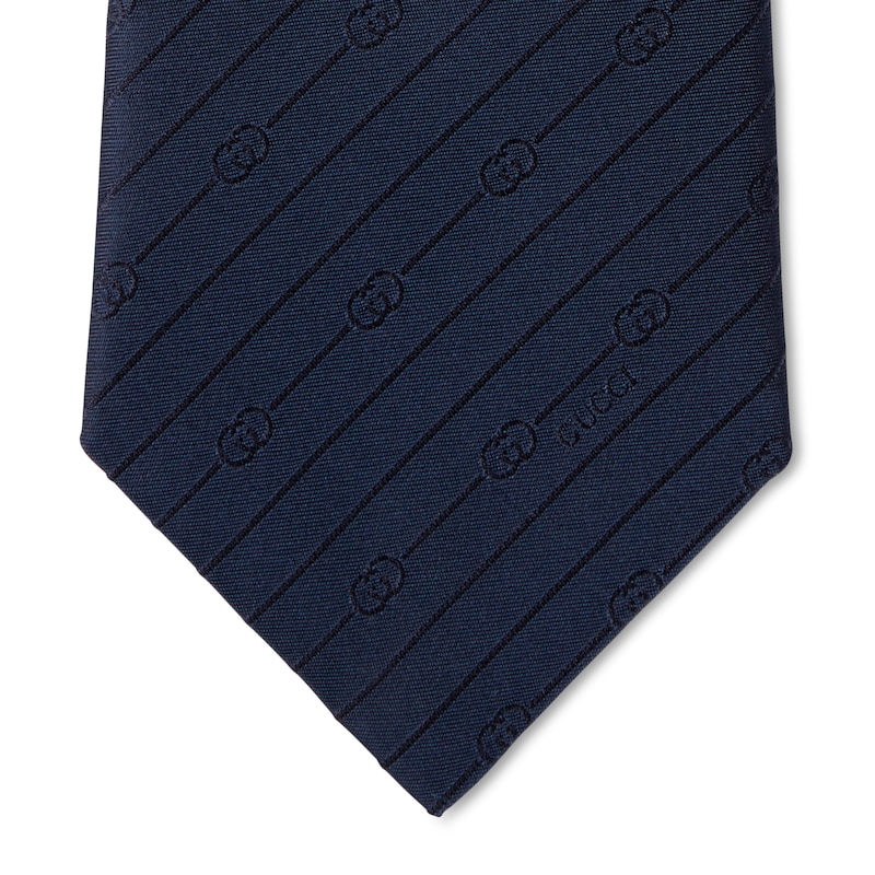 2026早春系列男士桑蚕丝配饰植根于品牌典藏设计,匠心结合丰蕴传承与现代风尚。这款领带以互扣式双G桑蚕丝提花面料打造,背面匠心缀饰Gucci蜜蜂标签。