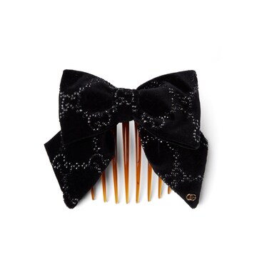 2026早春系列女士软配饰巧妙融合品牌典藏设计与风靡20世纪90年代的华丽风尚。这款发卡以柔软天鹅绒打造,匠心缀饰GG水晶和双G细节。