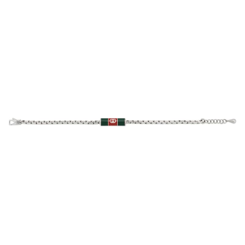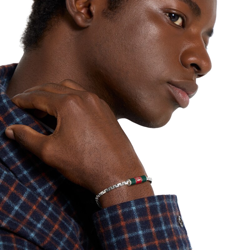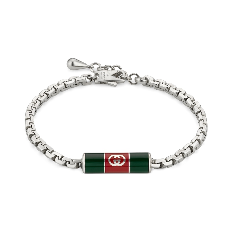 品牌银饰珠宝系列以华贵材质、精湛工艺与清新色调焕新诠释标志性图案。这款手链巧妙融入圆柱形织带细节,成就系列典范之作。