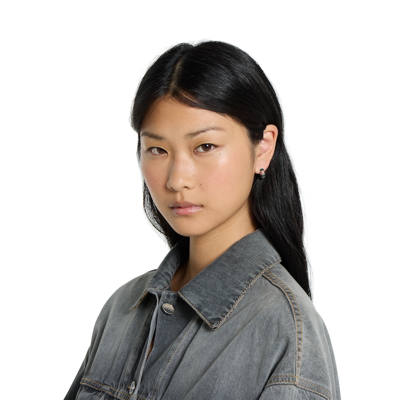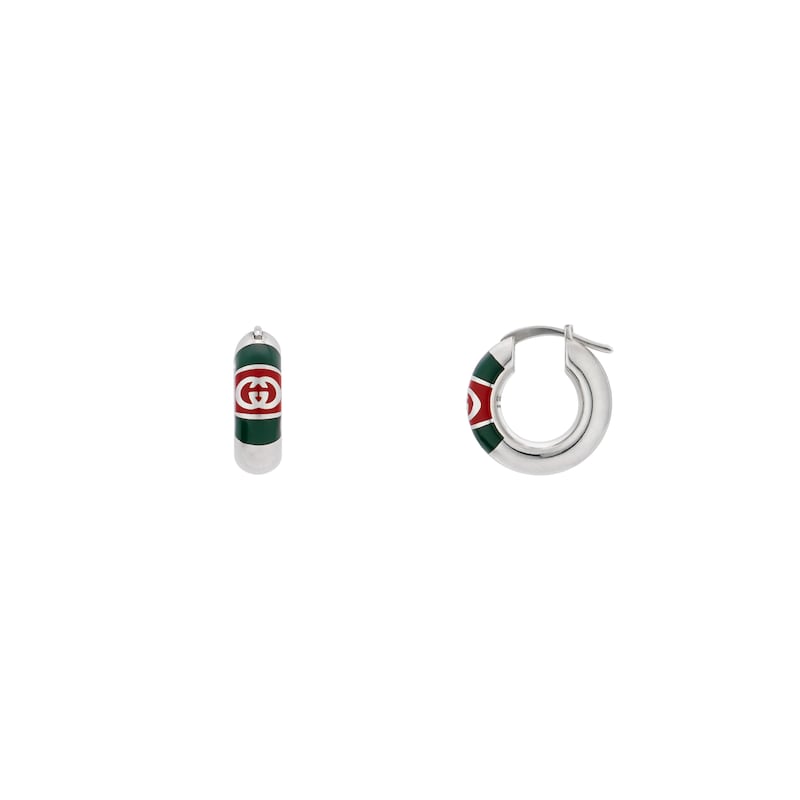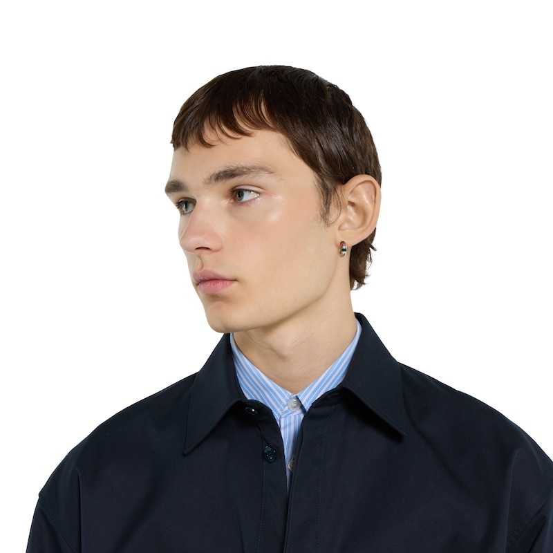 品牌银饰珠宝系列以华贵材质、精湛工艺与清新色调焕新诠释标志性图案。这款耳环巧妙融入圆柱形织带细节,成就系列典范之作。