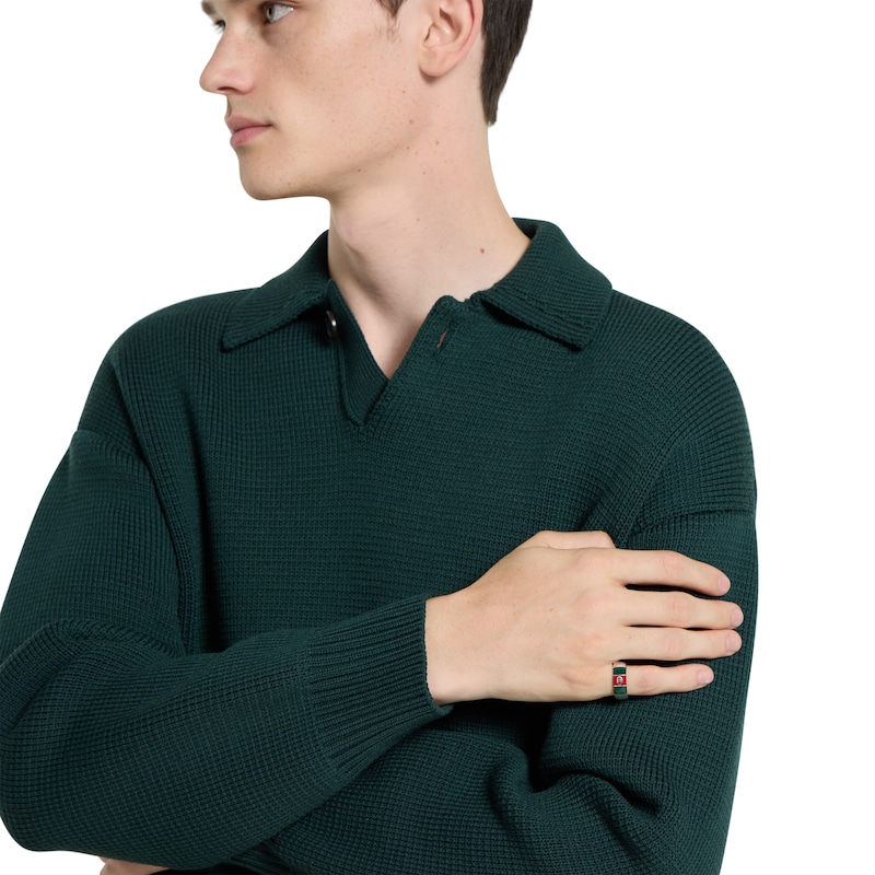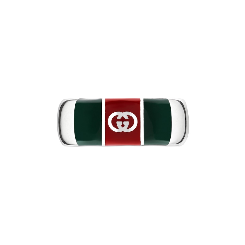 品牌银饰珠宝系列以华贵材质、精湛工艺与清新色调焕新诠释标志性图案。这款宽版戒指巧妙融入圆柱形织带细节,成就系列典范之作。