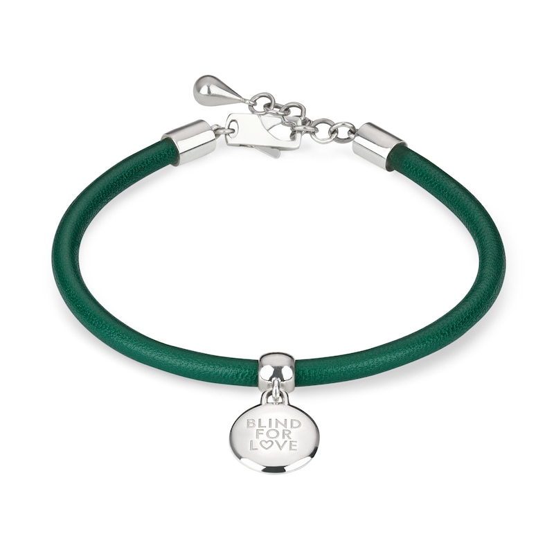 品牌银饰珠宝系列焕新诠释标志性图案,巧妙糅合华贵材质、精湛工艺与精致格调,匠心呈献这款“Blind For Love”手链,搭配皮革饰边与刻花坠饰,一展魅力风尚。