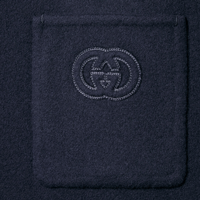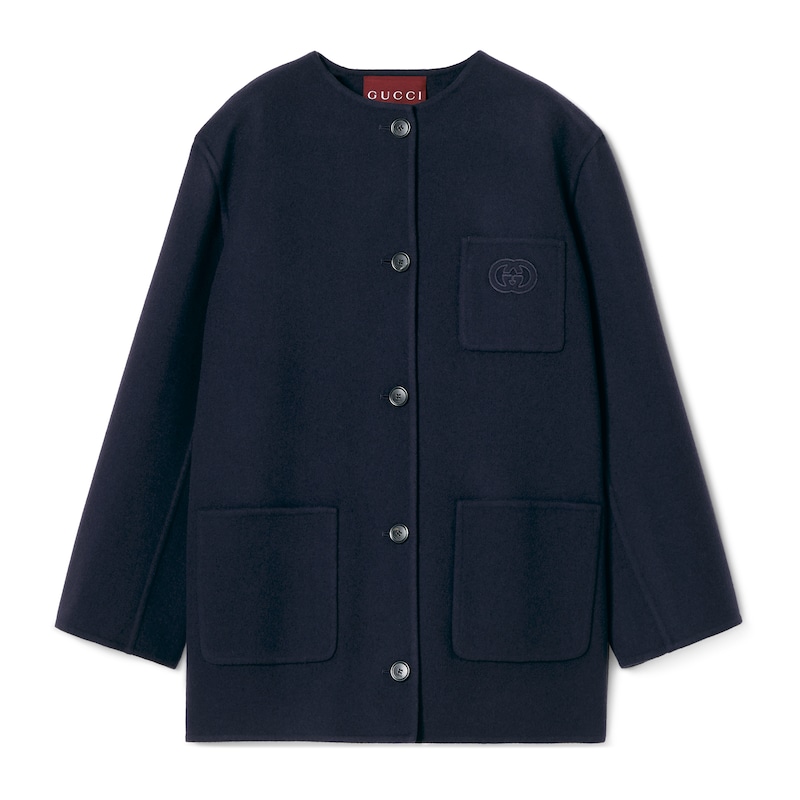 2025早秋系列革新诠释保暖面料,融蕴传统和现代廓形,缔就精致外套单品。这款无领大衣以羊毛混纺面料打造,匠心缀饰互扣式双G刺绣细节。