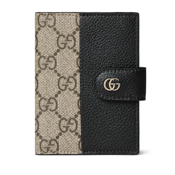 GG Marmont系列匠心呈现双色款式。这款卡片夹以米色和深棕色GG Supreme帆布匠心打造,搭配黑色撞色皮革内里和滚边,巧妙融入浅金色调饰面经典双G造型配件。