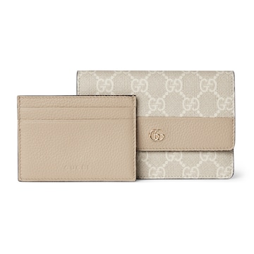 品牌将多种清新色调引入GG Marmont系列。这款钱包以米色皮革与白色和米色GG Supreme匠心打造。标志性双G造型配件令整个设计魅力倍添。