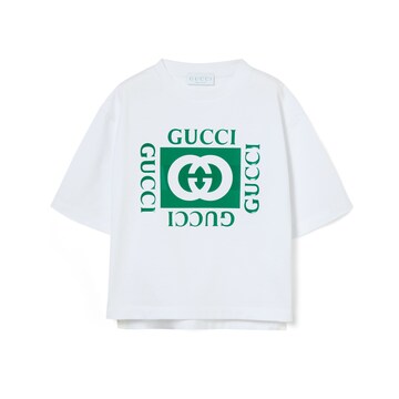 品牌童装系列以经典材质、精湛工艺与清新色调焕新诠释标志性图案。这款儿童T恤甄选针织棉打造,巧妙缀饰Gucci互扣式双G条纹印花,一展亮眼魅力。