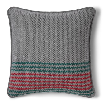 Gucci家饰系列秉承经典,以甄选材质、精湛工艺与清新色调焕新演绎GG、织带、竹节、马衔扣及马术元素等品牌经典图案。这款山羊绒提花靠垫缀饰以正交编织工艺打造的条纹织带,突显纹理感十足的背景。
