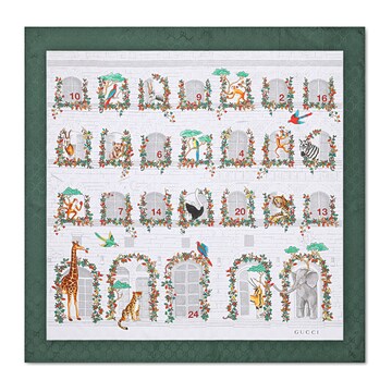 品牌桑蚕丝配饰系列秉承经典,以华贵材质、精湛工艺与清新色调焕新演绎GG、织带、Flora花卉、竹节、马衔扣及马术元素等品牌经典图案。这款轻质桑蚕丝斜纹方巾匠心点缀圣诞倒数日历和动物印花。