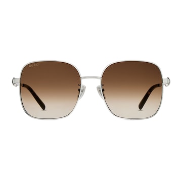 品牌眼镜系列秉承经典,以甄选材质、精湛工艺与清新色调焕新演绎GG、织带、竹节、马衔扣及马术元素等品牌经典图案。这款方形镜框太阳眼镜以银色调金属打造,配以饰马衔扣细节的镜腿。