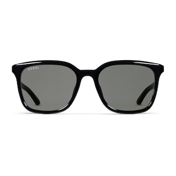 品牌眼镜系列秉承经典,以甄选材质、精湛工艺与清新色调焕新演绎GG、织带、竹节、马衔扣及马术元素等品牌经典图案。这款贴合设计太阳眼镜以黑色醋纤打造,匠心缀饰Gucci铭牌刻花。