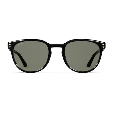 品牌眼镜系列秉承经典,以甄选材质、精湛工艺与清新色调焕新演绎GG、织带、竹节、马衔扣及马术元素等品牌经典图案。这款圆形镜框太阳眼镜采用贴合设计,甄选光泽感黑色醋酸酯打造,匠心缀饰铆钉和Gucci标识。