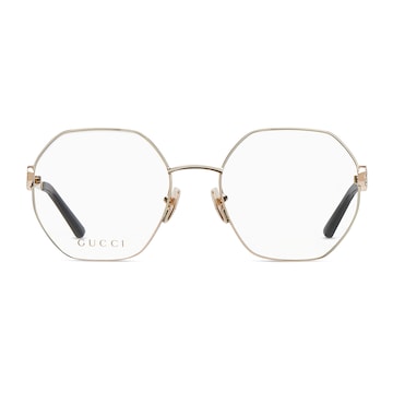品牌眼镜系列秉承经典,以甄选材质、精湛工艺与清新色调焕新演绎GG、织带、竹节、马衔扣及马术元素等品牌经典图案。这款方形镜框甄选金色调金属打造,镜腿匠心缀饰水晶互扣式双G细节。