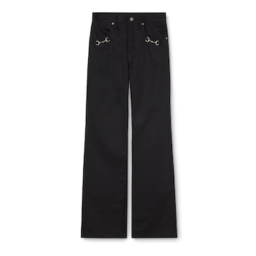 2026春夏系列全新上市。这款单品亮相于La Famiglia系列“Nerd”和“L'Introverso”造型,以独特个性和鲜明美学态度焕新诠释品牌标识。这款长裤甄选棉质丹宁面料打造,缀饰马衔扣细节和压花皮革标签。