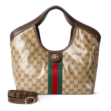 2026春夏系列全新上市。Gucci Giglio系列手袋以皮革饰边提手进一步升华设计,致敬品牌意大利渊源,诠释传承与重塑的精神。包身采用全新涂层GG面料,呈现柔软触感与光泽外观,内衬则焕新演绎源自品牌典藏的钻石菱格纹图案。