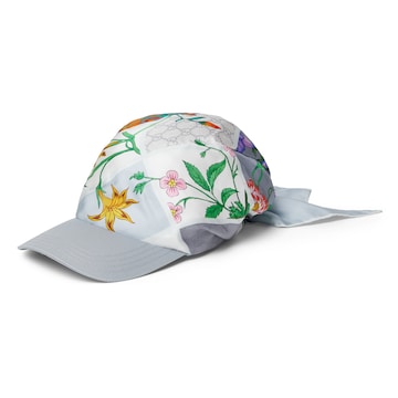 品牌桑蚕丝配饰系列秉承经典,以华贵材质、精湛工艺与清新色调焕新演绎GG、织带、Flora花卉、竹节、马衔扣及马术元素等品牌经典图案。这款棒球帽甄选浅灰色斜纹桑蚕丝打造,通体GG格纹花卉印花尽释别致韵调。