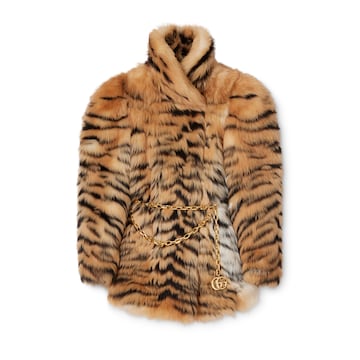2026春夏系列全新上市。这款风格是La Famiglia“La Bomba”造型的一部分,以鲜明个性与美学态度诠释品牌设计元素。这款外套采用嵌花柔顺长羊毛皮匠心打造,配有饰双G细节的可拆卸链条腰带。