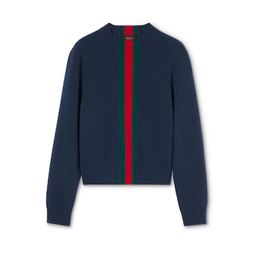 2026春夏系列全新上市。这款单品设计灵感源自La Famiglia系列“Pesantone”造型。本系列以独特个性和鲜明美学态度焕新诠释品牌标识。这款毛衣甄选精细针织羊毛打造,精心缀饰织带嵌花。