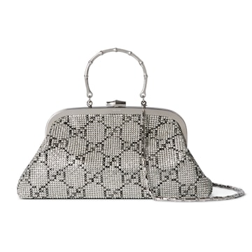 2026春夏系列全新上市。 这款晚宴包在《La Famiglia》系列的“La Primadonna”造型中呈现。它由通体GG仿水晶网纱打造,包内丝缎衬里缀饰“Made in Italy by Gucci”标签,并搭配竹节细节配件,呼应品牌传承。