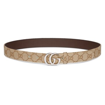 2026年春夏系列全新上市。女士腰带系列焕新演绎双 G 搭扣设计,采用简约扁平版型,彰显品牌标志性元素精髓。这款 GG Marmont 系列腰带选用沙色 GG 帆布打造,搭配银色调配件。