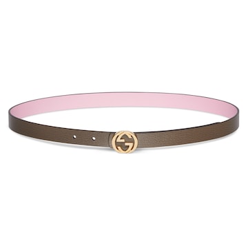 2026年春夏系列全新上市。女士腰带系列焕新演绎双 G 搭扣设计,采用简约扁平版型,彰显品牌标志性元素精髓。这款双面窄版腰带选用浅粉色和深灰褐色软粒面牛皮革打造,搭配金色调配件。
