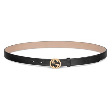 2026年春夏系列全新上市。女士腰带系列焕新演绎双 G 搭扣设计,采用简约扁平版型,彰显品牌标志性元素精髓。这款窄版腰带采用黑色牛皮革打造,搭配金色调配件。
