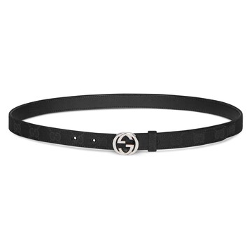 2026年春夏系列全新上市。女士腰带系列焕新演绎Interlocking G 搭扣设计,采用简约扁平版型,彰显品牌标志性元素精髓。这款窄版腰带以黑色GG帆布打造,搭配银色调配件。