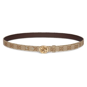 2026年春夏系列全新上市。女士腰带系列焕新演绎Interlocking G 搭扣设计,采用简约扁平版型,彰显品牌标志性元素精髓。这款窄版腰带采用沙色GG帆布制成,搭配金色调配件。