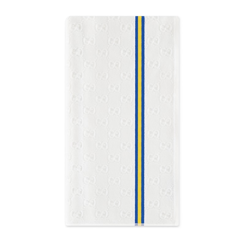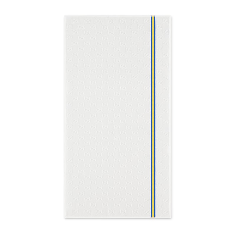 软配饰携传统印花和俏皮色调惊喜现身,其中不乏沙滩罩衫、渐变色纺织品,以及带配套收纳袋的可折叠双面帽子。这款沙滩毯以GG棉质厚绒布打造,匠心融蕴蓝色和黄色滚边,意在向美国网球公开赛标志性颜色致敬。