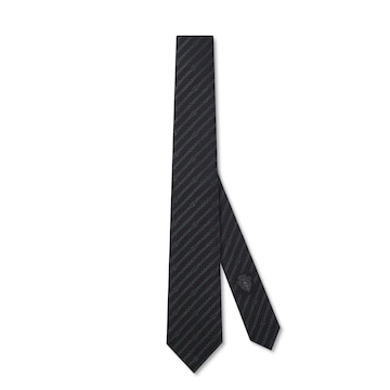 隆重推出2026春夏系列。La Famiglia系列中,桑蚕丝和柔软配饰设计继续通过创意视角重新演绎品牌标志性元素。这款领带采用互扣式双G链带桑蚕丝提花面料,背面展示Gucci徽章标签。