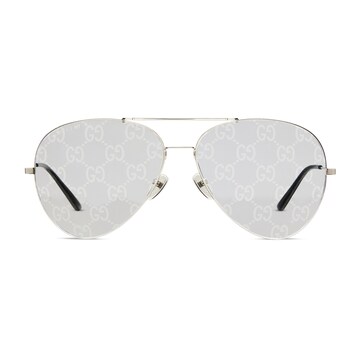春夏2026系列隆重推出。独特的眼镜形状融合标志性元素,为整个系列注入一脉相承的设计灵感。这款款式在La Famiglia的多个造型中均有呈现。镜框采用金属材质,镜腿饰有Interlocking G细节,搭配镜面Guccissima镜片。