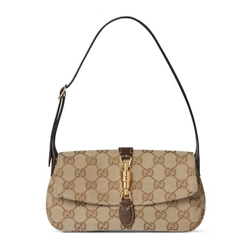 新款小皮具设计向Gucci Jackie 1961系列手袋致敬,融合现代造型与多功能性。此单品可通过附加肩带实现单肩或斜挎两种背携方式。包身采用轻质且挺括的GG帆布打造,配以金色调推入式所锁扣金属配件,内部空间可轻松容纳一部iPhone手机。