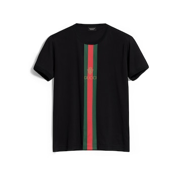 Generation Gucci 深入探索品牌的典藏设计元素,将不同世代的设计融合成一种美学叙事。织带的现代诠释点缀精选成衣单品,突显高级质感和当代细节。这款针织棉T恤以织带与Gucci徽章印花为设计亮点。