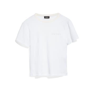 Generation Gucci 深入探索品牌典藏设计元素,将不同世代的设计融合于一体,谱写出独特的美学篇章。标识的现代诠释点缀精选成衣单品,凸显高级质感和当代细节。这款圆领T恤以针织棉匠心打造,缀饰Gucci天鹅绒刺绣。